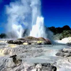 Visite à pieds de la vallée volcanique de Waimangu, un des plus jeunes écosystèmes de la planète, né de l’éruption du volcan Tarawera en 1886. Vous y observerez les sources chaudes, bassins d’acide colorés et vapeurs qui s’élèvent parmi la végétation.