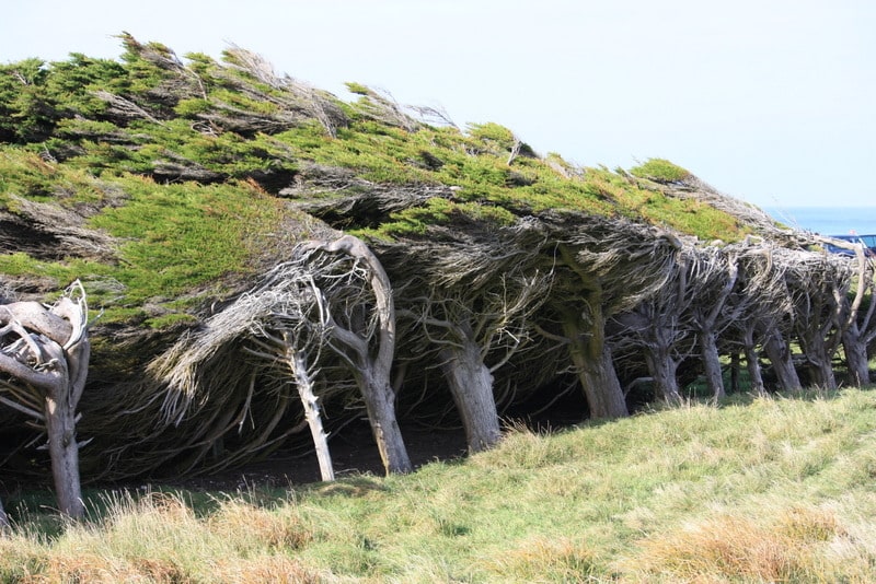 - Slope Point, c’est ici que vous vous trouverez au point le plus austral de l’ile du Sud. Il s’agit également d’un point très venteux, vous pourrez y sentir le vents (très) frais venant de l’Antarctique. Vous y accèderez par une courte marche de 20 min, durant votre balade n’oubliez pas d’admirez les arbres qui ont pour particularités, à cause du vent très forts, de pousser sur les côtés.