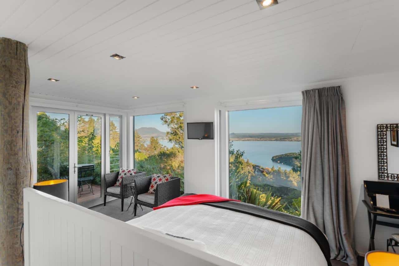Acacia Cliffs Lodge est un hôtel boutique de luxe situé à Taupo, offrant une vue spectaculaire sur le lac Taupo et les montagnes environnantes.